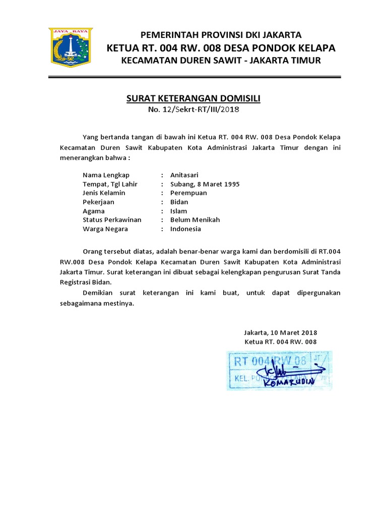 Pendatang bisa sekaligus meminta surat keterangan RT untuk mengajukan surat keterangan domisili sementara SKDS ke kecamatan. Mekanisme pelayanan perizinan yang akan dilalui. Contoh Surat Domisili Jakarta Selatan Dinas penanaman modal dan pelayanan terpadu satu pintu provinsi dki jakarta.